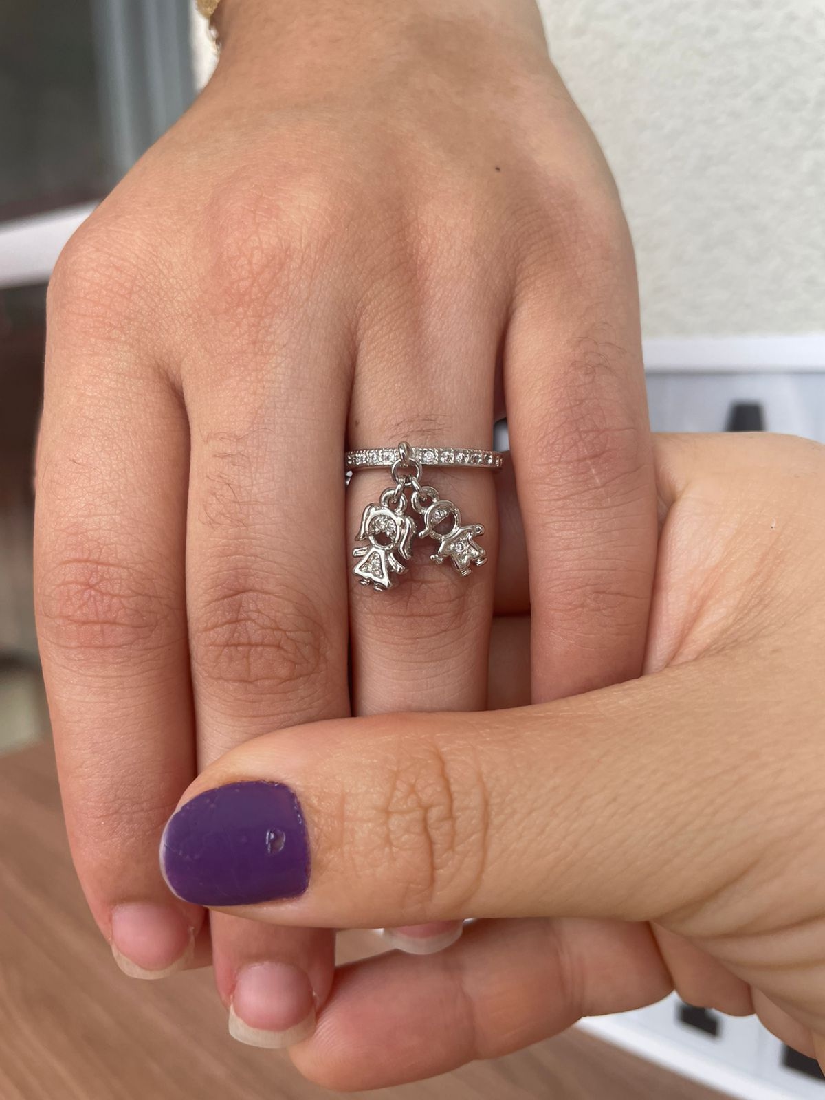 Característica: Banho de Ródio cravejado com microzircônias e pingente em formato de um menino e uma menina