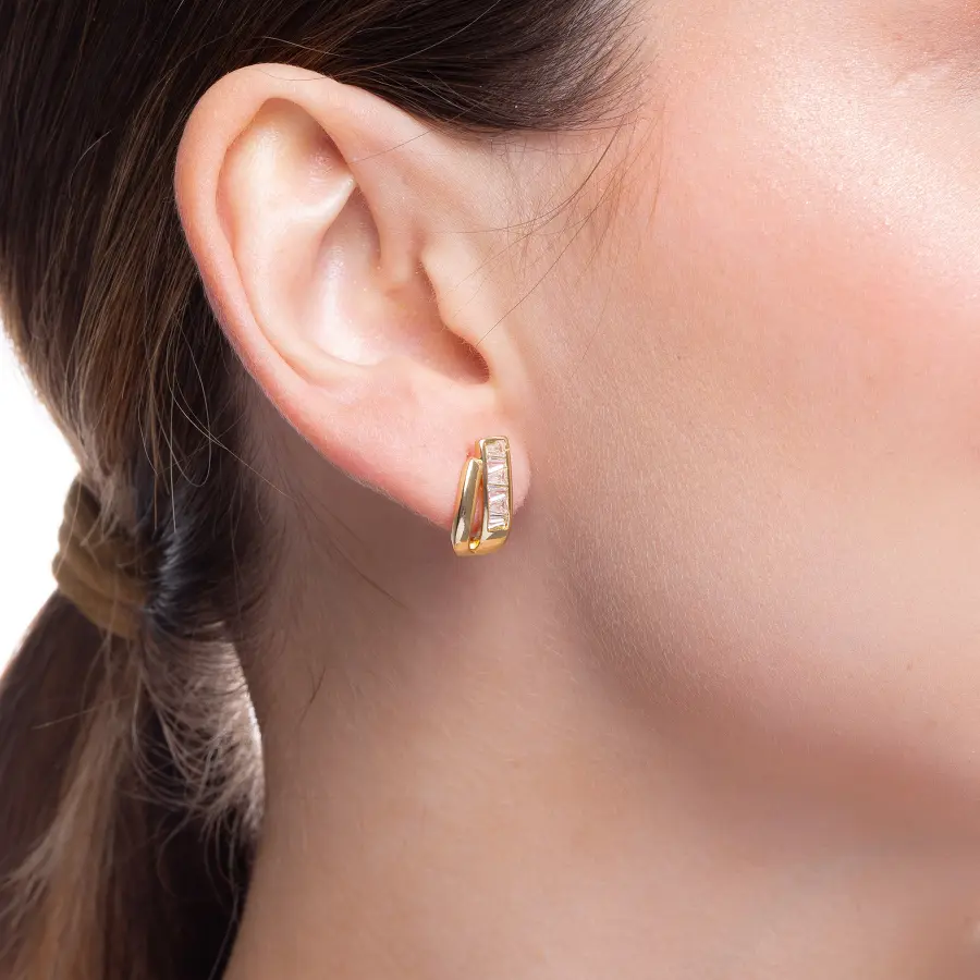Brinco Assimétrico Liso e Cravejado Navete Banho de Ouro 18K
