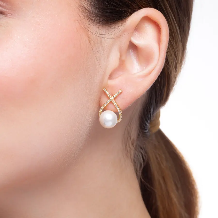 Especificações: Brinco X com micro zircônias cristais cravejadas e pérola no meio, banhado a ouro.